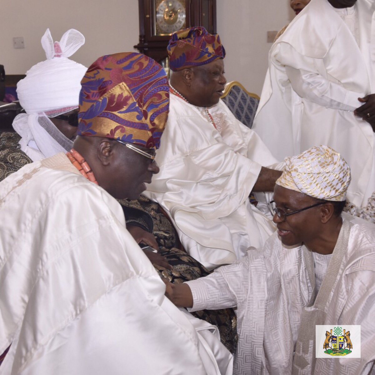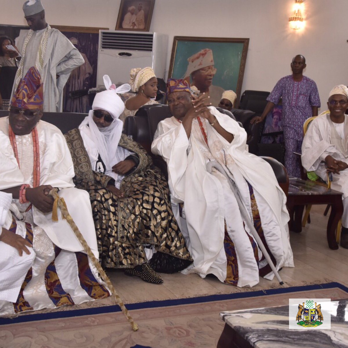 Kaduna state Governor Nasir El Rufai, former president, Olusegun Obasanjo, Oba Of Lagos, Ridwan Akiolu and Emir of Kano, Sanusi are in Ijebu-Ode as the Awujale of the Ijebu Kingdom gives out his daughter's hand in Marriage today. See photos below