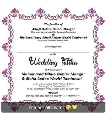 Aisha, one of the daughters of Sokoto state governor, Aminu Tambuwal, will be getting married on Saturday December 31st, 2016. Aisha will be getting married to her fiance, Muhammad Dikko Dahiru, in Sokoto state. See Wedding IV below: